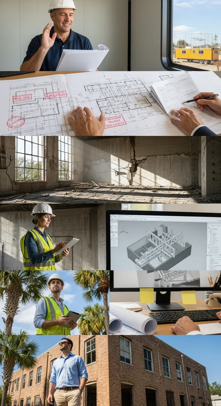 Lateral systems that look adequate on paper but aren't. Older Florida industrial and commercial buildings were designed to wind standards that have been superseded by multiple code cycles. When a conversion triggers substantial improvement review, the lateral system analysis often reveals deficiencies that weren't apparent from a visual inspection and that weren't flagged in a general condition assessment. Finding these before the permit application is submitted is what prevents the structural scope from expanding after design is underway.