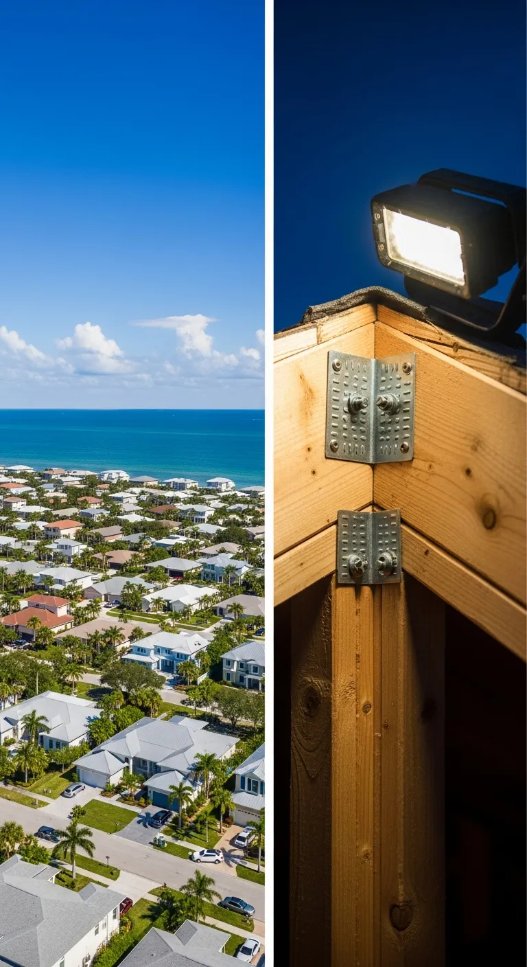Roof-to-wall connection deficiencies. Homes built before hurricane strapping requirements were enforced — roughly pre-2002 — frequently have roof framing that is attached to wall plates with toenail connections only. Those connections are inadequate under the wind loads Florida now requires. The roof looks fine. The connection is not.